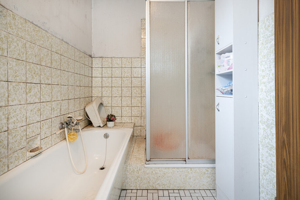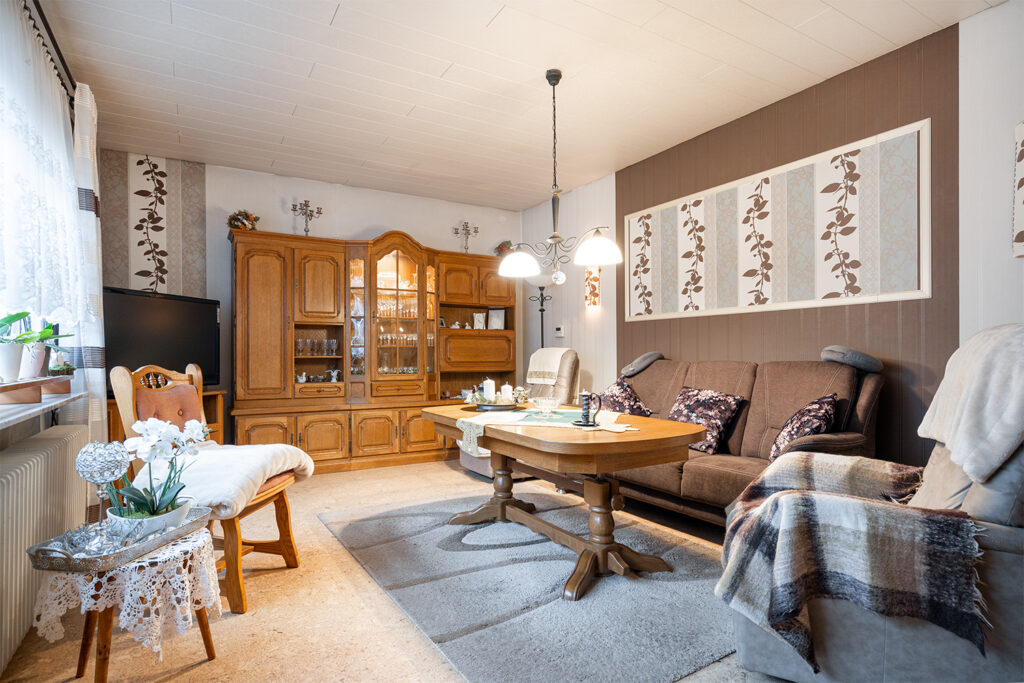 Das Erdgeschoss verfügt über eine klassische Raumaufteilung. Hier befinden sich zwei Zimmer, die flexibel als Büro, Gäste- oder Schlafzimmer genutzt werden können, ein Wohnzimmer, ein Gäste-WC, ein Badezimmer mit Dusche und Badewanne sowie eine Küche mit Einbauküche (ca. 15 Jahre alt). Ergänzt wird das Erdgeschoss durch einen Hauswirtschaftsraum mit Zugang zur überdachten Terrasse.