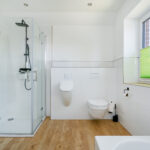 Bereits beim Betreten des Hauses vermittelt der großzügige Eingangsbereich mit hellem Flur ein offenes Wohngefühl. Das Erdgeschoss beeindruckt vor allem durch den weitläufigen Wohn- und Essbereich mit bodentiefen Fenstern, die für eine lichtdurchflutete Atmosphäre sorgen. Von hier aus gelangen Sie direkt auf die große Terrasse, die zum Entspannen und Genießen einlädt.