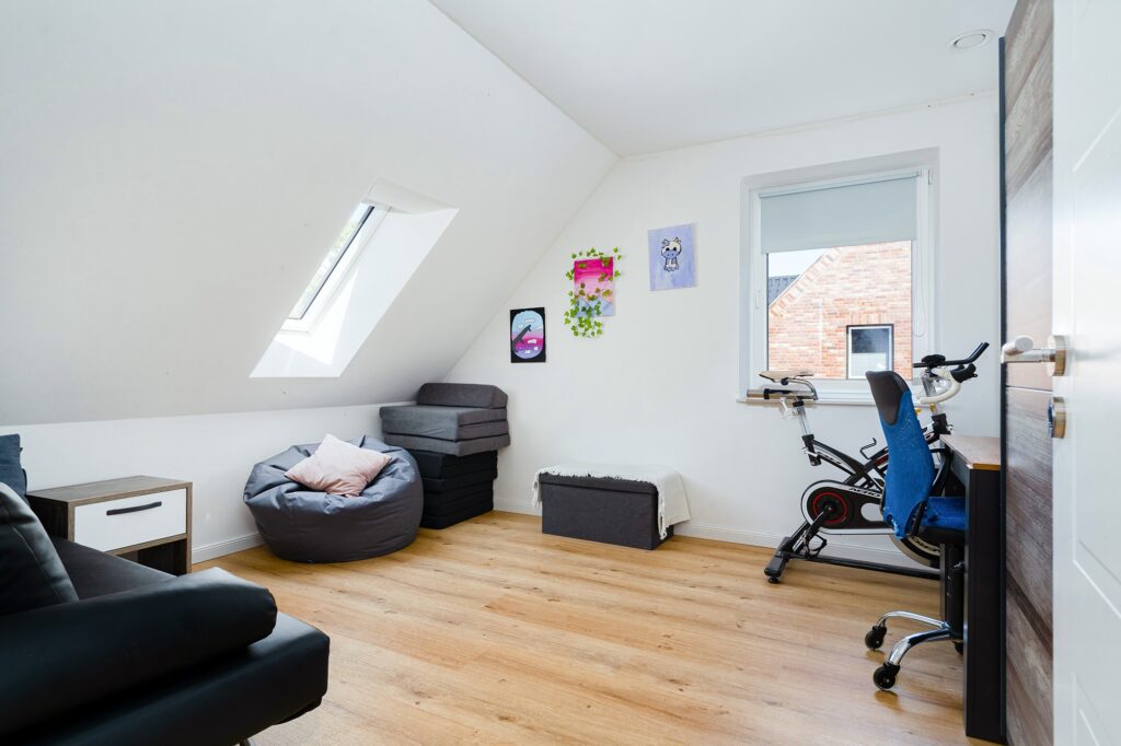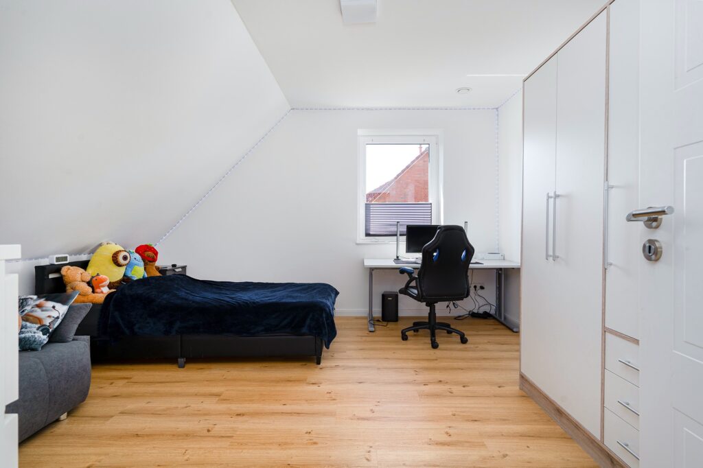 Im Dachgeschoss erwarten Sie vier große Schlafzimmer, die individuell als Kinder-, Gäste- oder Arbeitszimmer genutzt werden können. Das moderne Badezimmer ist mit einer Badewanne und separater Dusche ausgestattet und bietet auch für Familien ausreichend Platz. Zusätzlich ist im Flur ein Zugang zum Dachboden vorhanden, der weiteren Stauraum bietet.
