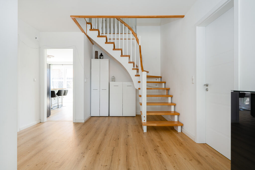 Bereits beim Betreten des Hauses vermittelt der großzügige Eingangsbereich mit hellem Flur ein offenes Wohngefühl. Das Erdgeschoss beeindruckt vor allem durch den weitläufigen Wohn- und Essbereich mit bodentiefen Fenstern, die für eine lichtdurchflutete Atmosphäre sorgen. Von hier aus gelangen Sie direkt auf die große Terrasse, die zum Entspannen und Genießen einlädt.