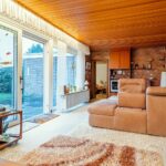 Im Erdgeschoss befindet sich ein großzügiges Wohnzimmer mit breiter Fensterglasfront und direktem Zugang zur Terrasse. Ein großes Schiebeelement sorgt für ein komfortables Öffnen, viel Licht und ein offenes Wohngefühl. Elektrische Jalousien sowie eine elektrisch ausfahrbare Markise erhöhen den Wohnkomfort. Die mit Riemchen gestalteten Wände verleihen dem Raum eine warme Atmosphäre, ein integrierter Essbereich rundet das Erdgeschoss harmonisch ab.