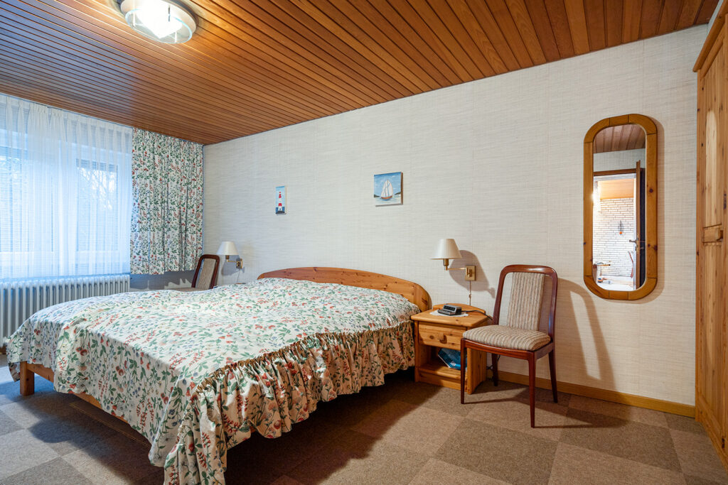 Ebenfalls im Erdgeschoss: die Küche, ein kleines Badezimmer, ein großes Elternschlafzimmer sowie zwei flexibel nutzbare Kinderzimmer – ideal auch als Gäste-, Büro- oder Hobbyräume.