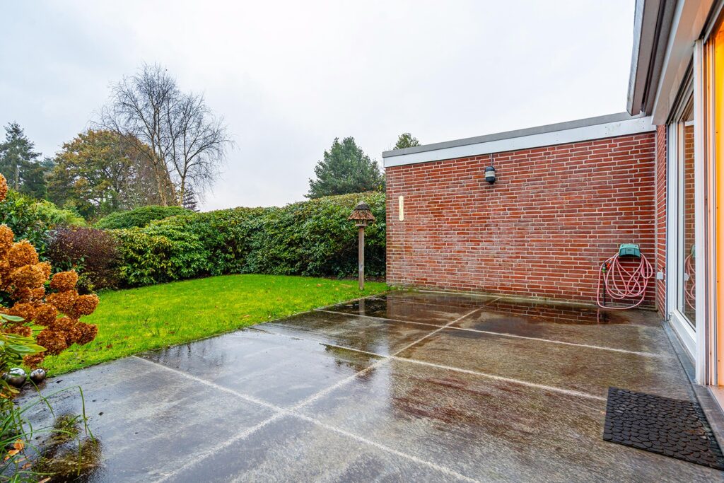 Der Außenbereich bietet eine großzügige Terrasse mit hochwertigen, großformatigen Fliesen und elektrischer Markise. Der Garten ist pflegeleicht und angenehm privat. Ein zusätzlicher Außenabstellraum schafft Platz für Fahrräder, Mülltonnen oder Gartengeräte.