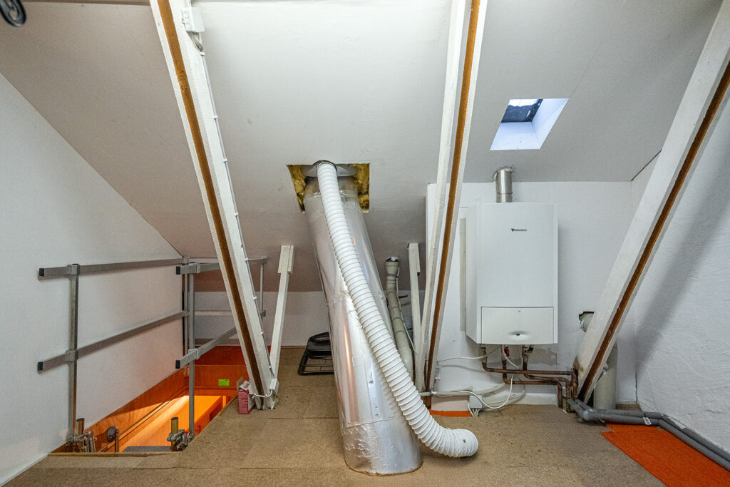 Das Obergeschoss erreichen Sie über eine elektrisch ausfahrbare Treppe. Dort befindet sich ein weiteres Schlafzimmer sowie ein kleiner Dachbodenbereich mit der modernen Gas-Brennwerttherme (Bj. 2017). Die Fenster wurden vor etwa zehn Jahren erneuert und befinden sich in sehr gutem Zustand.