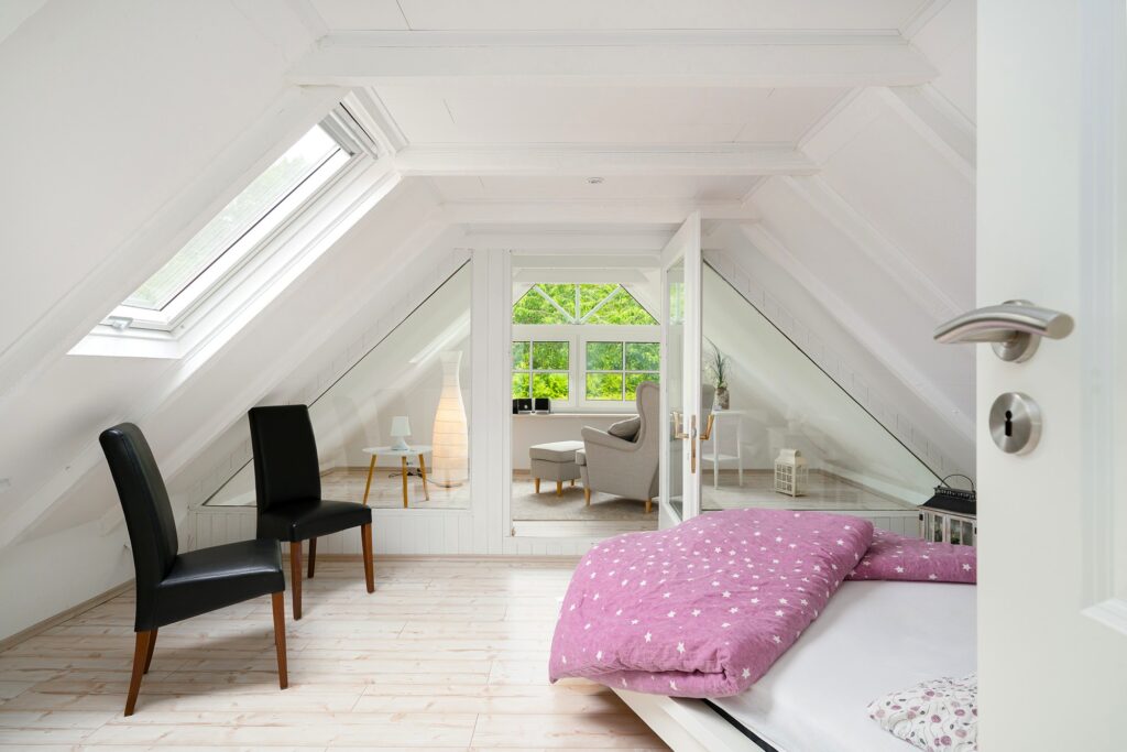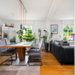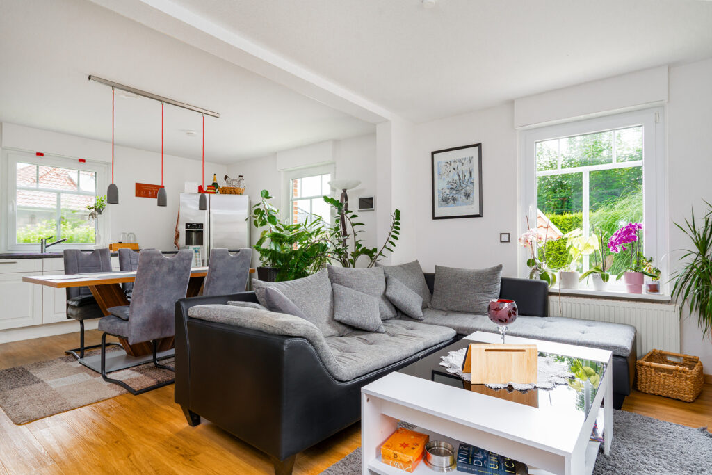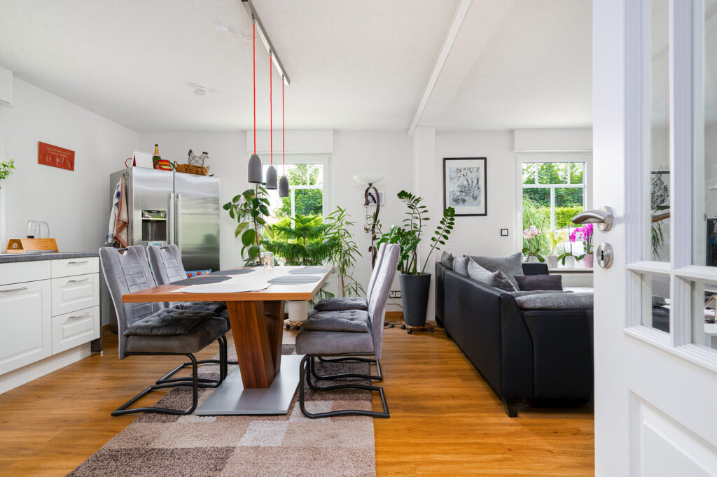 Der offene Wohnbereich mit sichtbarer Balkenlage und Galerie schafft ein wohnliches Ambiente. Die moderne Küche mit Markengeräten und Side-by-Side-Kühlschrank inkl. Festwasseranschluss lädt zum Kochen ein. Im Erdgeschoss sorgt eine neue Fußbodenerwärmung für behagliche Wärme.