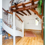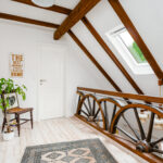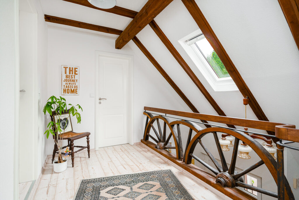 • Offener Wohnbereich mit sichtbarer Balkenlage und Galerie