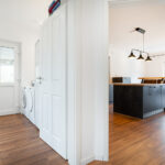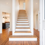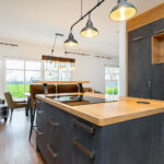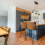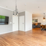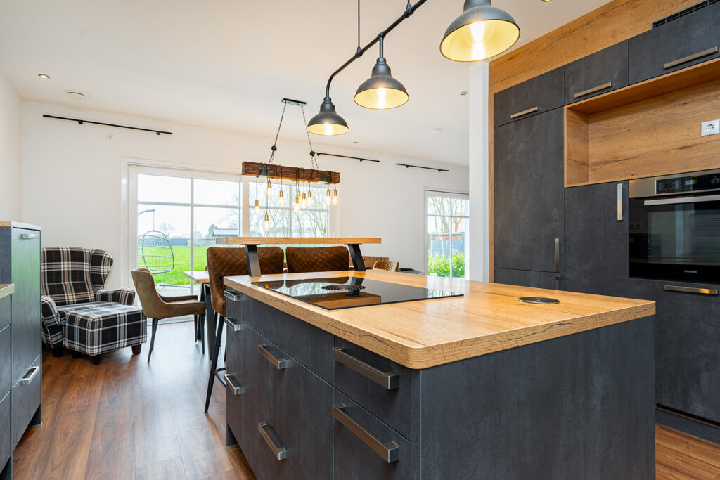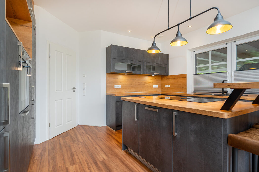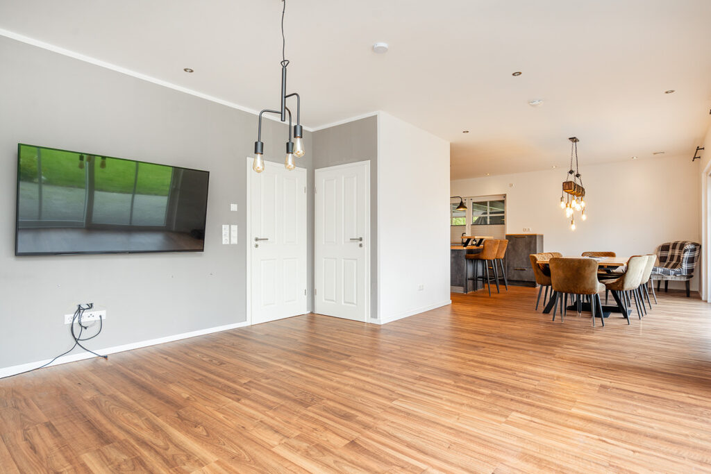 Bereits beim Betreten empfängt Sie ein einladender Eingangsbereich mit zentralem Flur. Ein besonderer Blickfang ist die stilvolle Treppe mit hochwertigen Holztreppenbelägen, die dem Haus sofort eine warme und elegante Ausstrahlung verleiht. Das Herzstück der Immobilie bildet der großzügige Wohn-, Ess- und Küchenbereich in offener Gestaltung über Eck. Die exklusive Küche mit Kochinsel und Tresenbereich fügt sich harmonisch in das Raumkonzept ein, während der Essbereich mit seinen großen Fensterflächen einen herrlichen Blick in den Garten eröffnet. Das angrenzende Wohnzimmer schafft den perfekten Rahmen für gemütliche Stunden und geselliges Beisammensein.