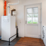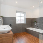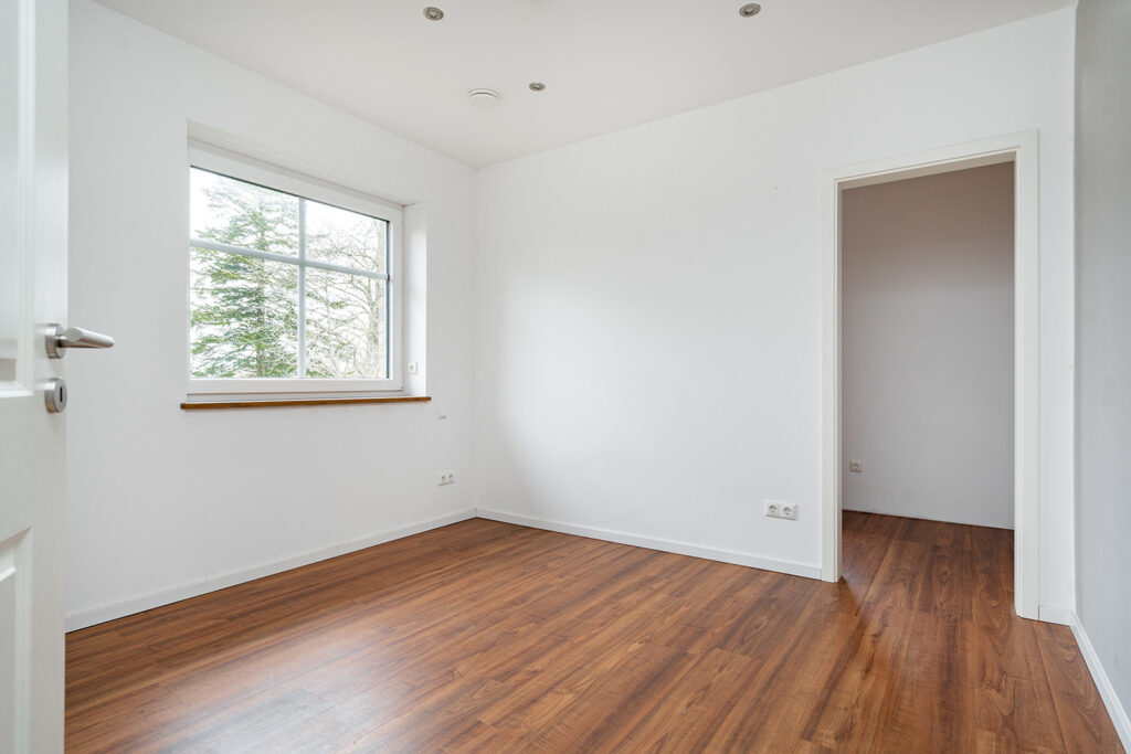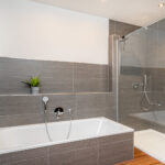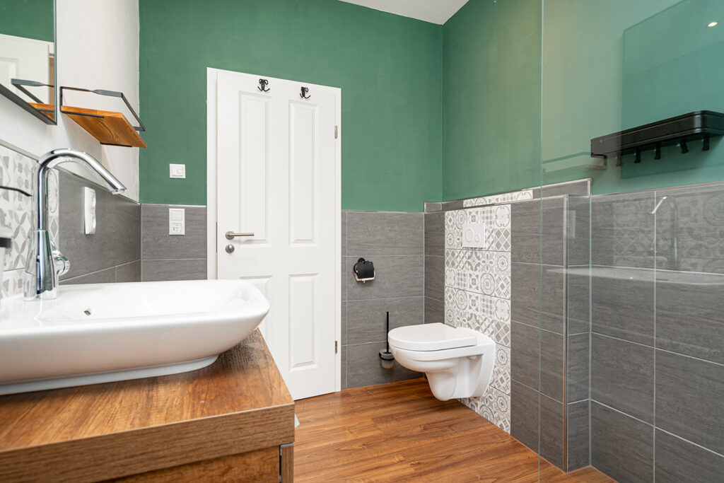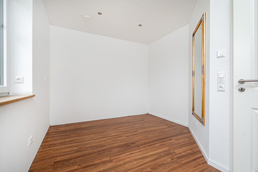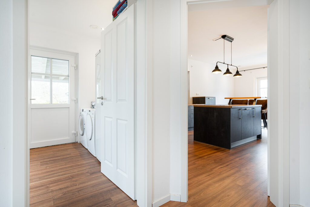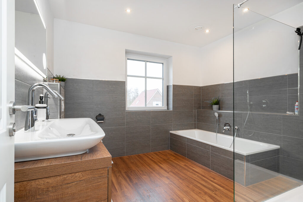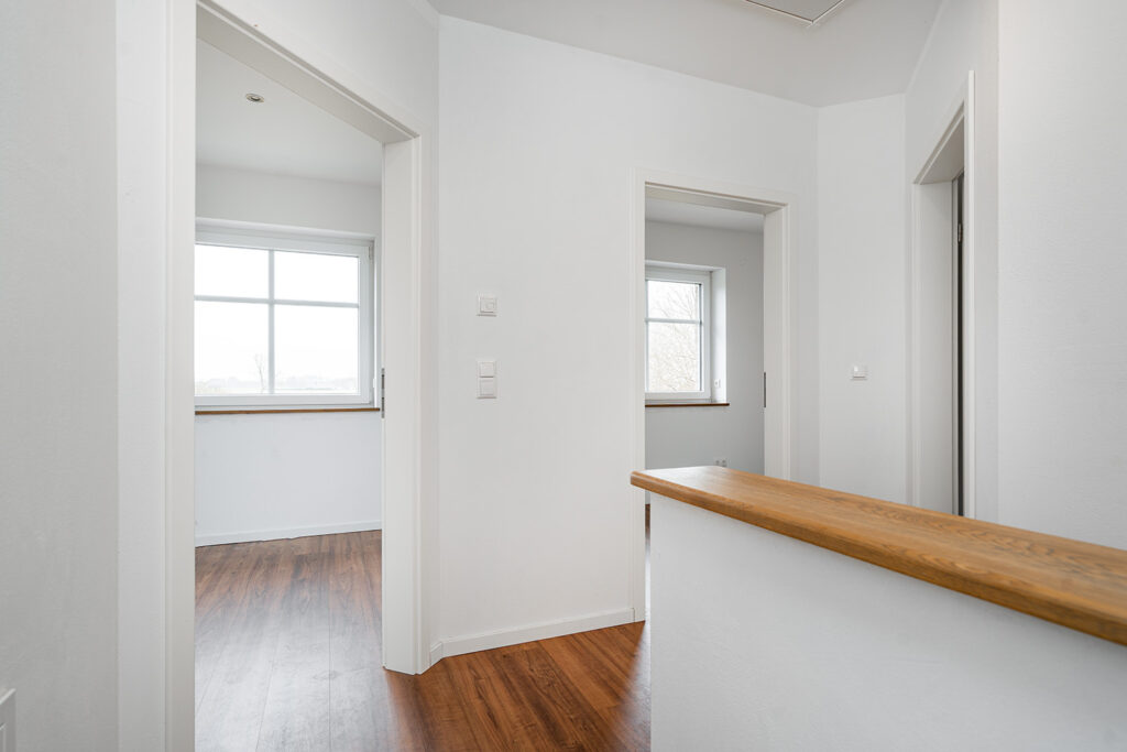 Im Erdgeschoss ergänzen ein Büro, ein Gäste-WC, ein Abstellraum sowie ein praktischer Hauswirtschaftsraum mit Waschmaschinenplatz und sämtlichen Versorgungsanschlüssen das durchdachte Raumangebot. Im Obergeschoss befindet sich ein hochwertig ausgestattetes Badezimmer mit Badewanne, Dusche, WC und zwei Waschbecken.